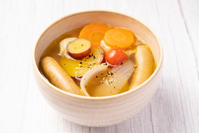 ・一口大に切ったさつまいも、ウインナー、玉ねぎ、人参を鍋に入れ、コンソメスープで煮込みます。